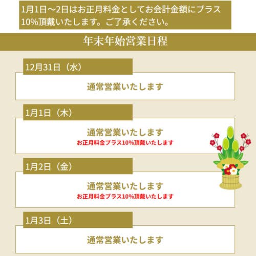 1月1日~2日はお正月料金としてお会計金額にプラス10%頂戴いたします。ご了承ください。